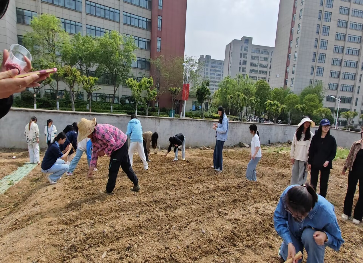在任娜老师和农技人员的指导下,同学们分组协作投入播种实践。翻土整地时,铁锹起落间扬起细碎土粒,虽汗湿衣襟却干劲十足;播撒种子时,大家俯身弯腰、间距丈量精准,力求每一粒种子都能在肥沃土壤中孕育希望。田间地头,青年学子们用沾满泥土的双手,将理论知识转化为劳动实践,在春耕一线展现出“懂农业、爱农村”的青春担当。