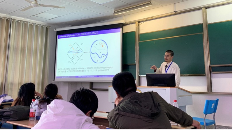 樊炜老师的报告题为《带质量的标量场的天球散射振幅》。天球全息是一个平坦全息框架,其中的带质量振幅的计算比较困难。经过不断研究,樊老师获得了一个带质量的三点天球振幅的解析表达式,进一步研究其质量趋于零的极限,发现相应共形算子的共形量纲必须满足特定的值,而这些特殊的共形量纲值也出现在天球全息的广义共形初级波函数以及代数中,这意味着天球全息中的共形量纲、流代数和无质量极限存在某种未知的奇妙联系。