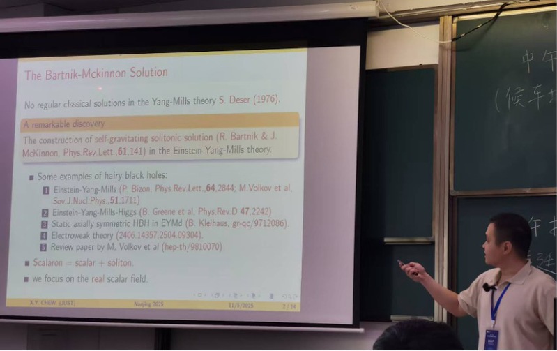 周孝严老师的报告题为《倒希格斯势中的自发引力标量孤子》。在以往的研究中,如Einstein-Klein-Gordon(EKG)理论,为构建规则的自发引力标量孤子解,往往需引入违反能量条件的phantom场,代价是其质量为负。周老师的研究表明,通过在EKG理论中引入倒希格斯的标量势函数,可以在不使用phantom场的前提下,获得带有正质量的规则孤子解。这一结果为构建更具物理意义的自发引力标量孤子提供了新的理论路径,也为理解引力与标量场相互作用机制提供了新的思考角度。