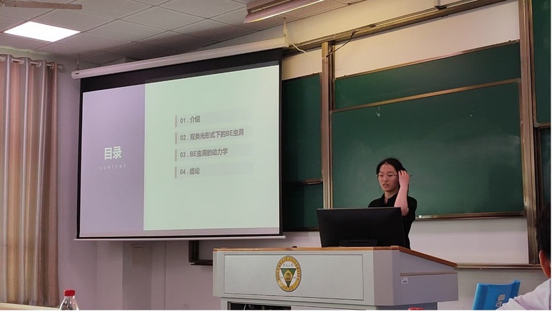 徐安源同学的报告题为《双零模拟下Bronnikov-Ellis(BE)虫洞的动力学研究》。该研究以可穿越的BE虫洞时空为背景,通过引入常规标量场与phantom场的脉冲扰动,对虫洞结构在不同激发条件下的动力学演化过程进行了数值模拟。研究发现:在常规标量场脉冲主导的情形下,虫洞结构最终坍缩形成黑洞;而在phantom场脉冲主导时,虫洞喉部发生分裂,演化为两个类德西特时空区域,表现出膨胀行为。进一步研究还表明,通过调节常规标量场与phantom场脉冲的入射时序,可以在一定条件下实现原本分裂的虫洞喉部的临时“缝合”,为延长虫洞的可穿越寿命提供了可能的理论方案。