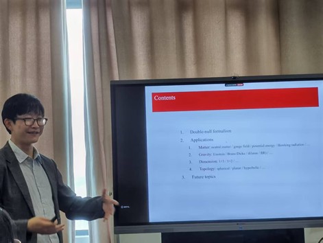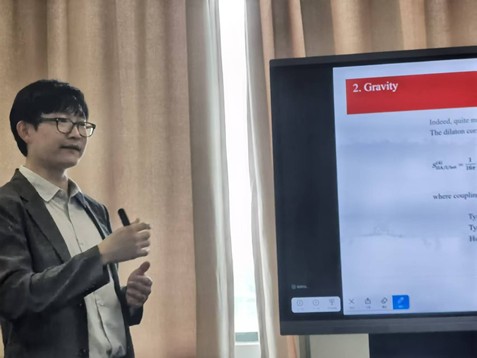 Yeom教授报告的题目为《Black Hole Factory: Introduction to Double-Null Formalism》。他深入介绍了“双类光形式”这一在现代引力理论研究中极具价值的工具,该工具在模拟黑洞坍缩时能有效克服坐标奇点问题,展现出独特优势。报告中,Yeom教授详细阐述了如何在双类光形式框架下推导运动方程、设定边界条件以及实施数值求解,引导师生们逐步理解该方法。