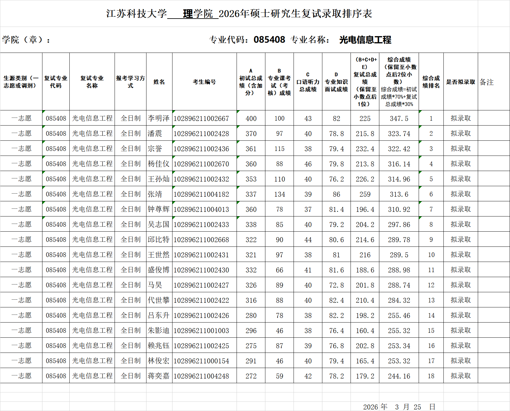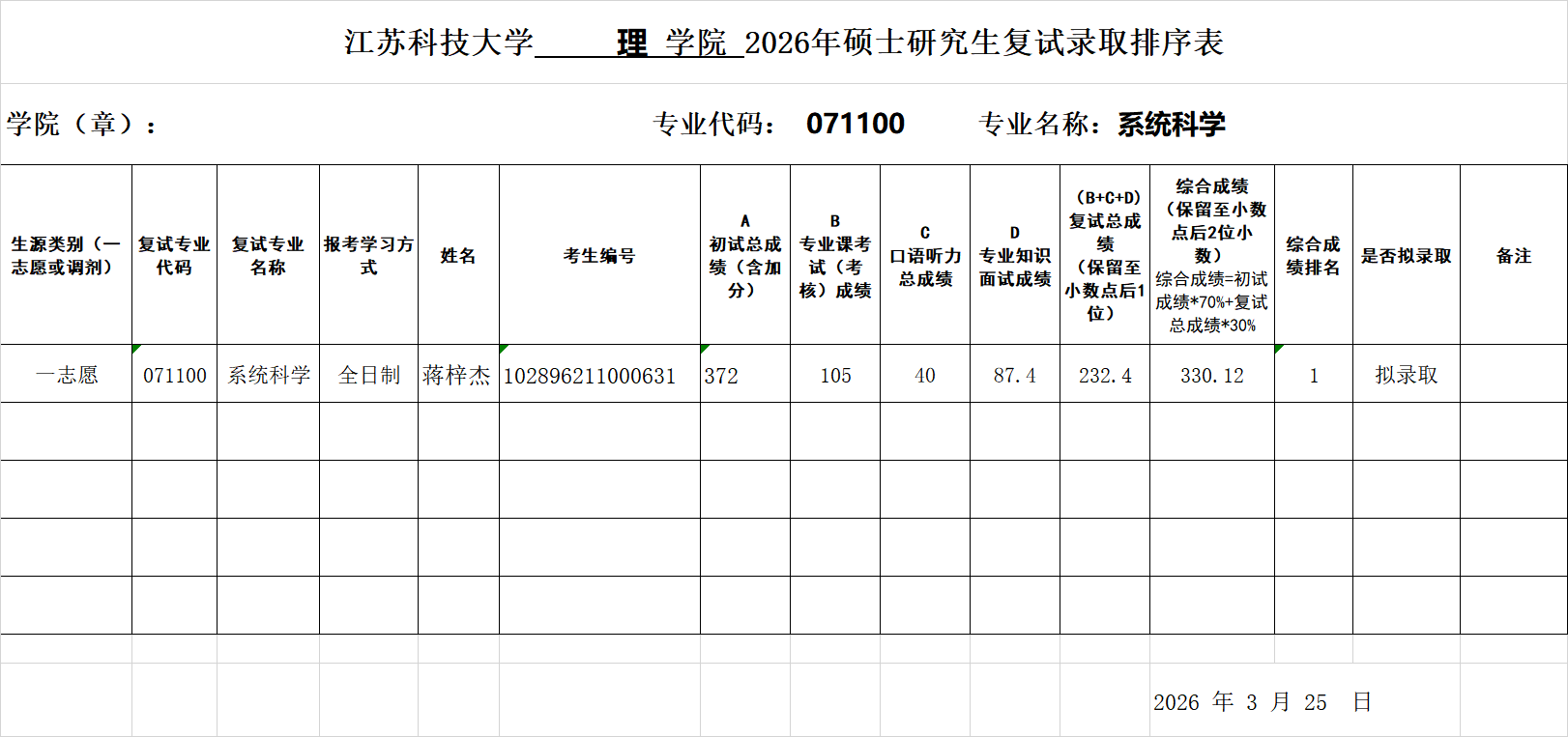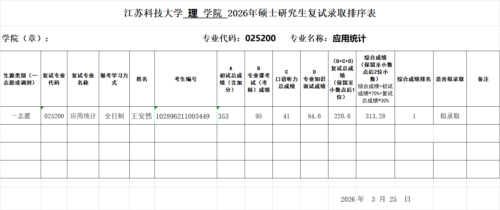 年硕士研究生复试录取排序表